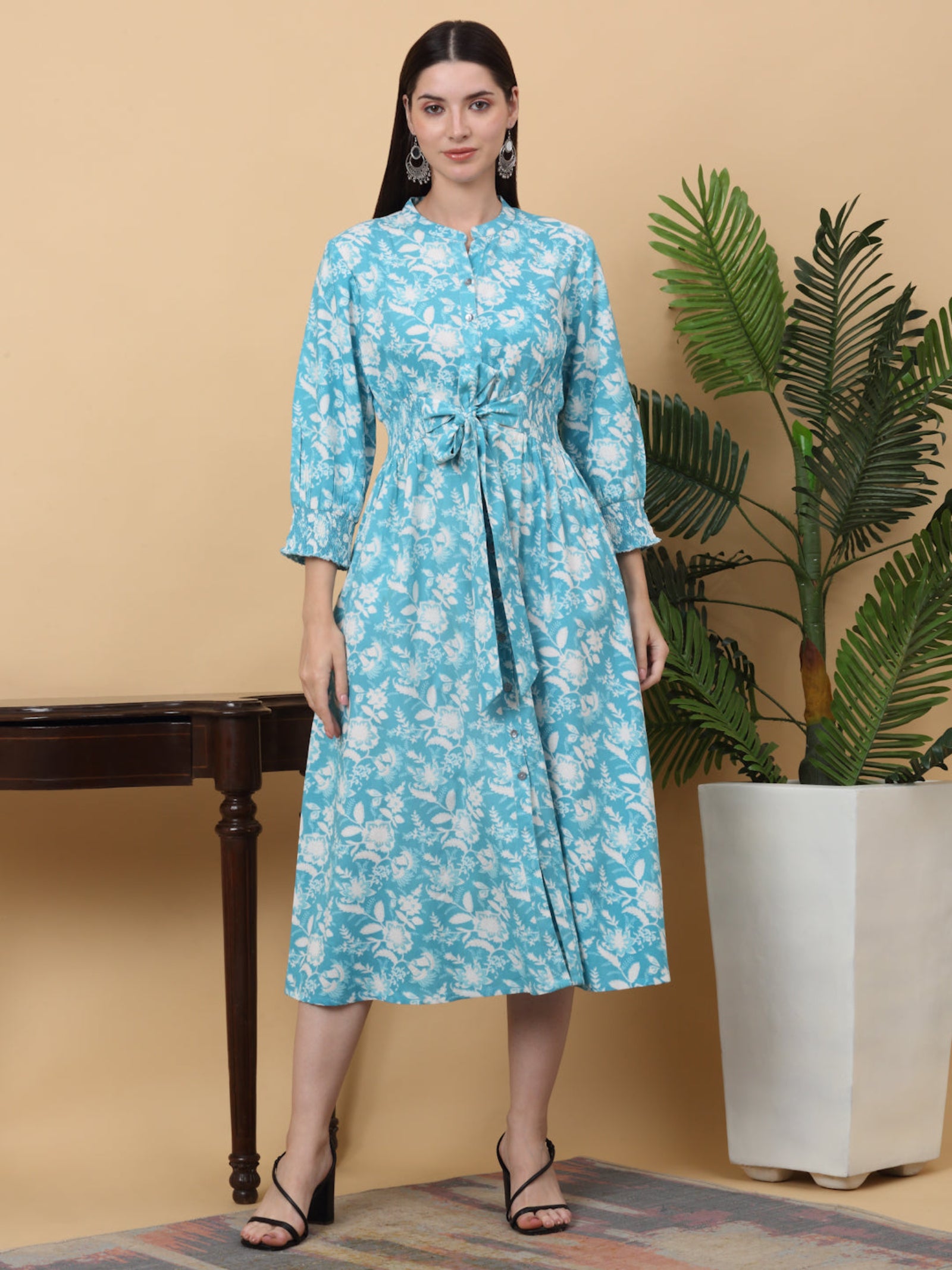 This elegant kurta combines a vibrant floral print in sky blue and maroon. Crafted from soft rayon, it features a mandarin collar, 3/4 sleeves, and a calf-length design. The button-down front with a belt adds a stylish touch, offering comfort and versatility for various occasions.