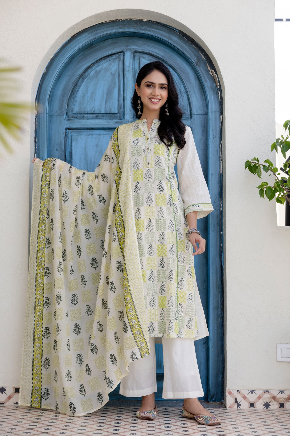 Stay stylish and comfortable with this green cotton embroidered kurta set from Maluka Women. Designed with fine embroidery, elegant border detailing, and chic button work, this kurta brings a perfect balance of tradition and modern appeal. The 3/4th sleeves add to its graceful look. Paired with a matching pant and dupatta, this set is an ideal choice for festive occasions, casual outings, or office wear.
