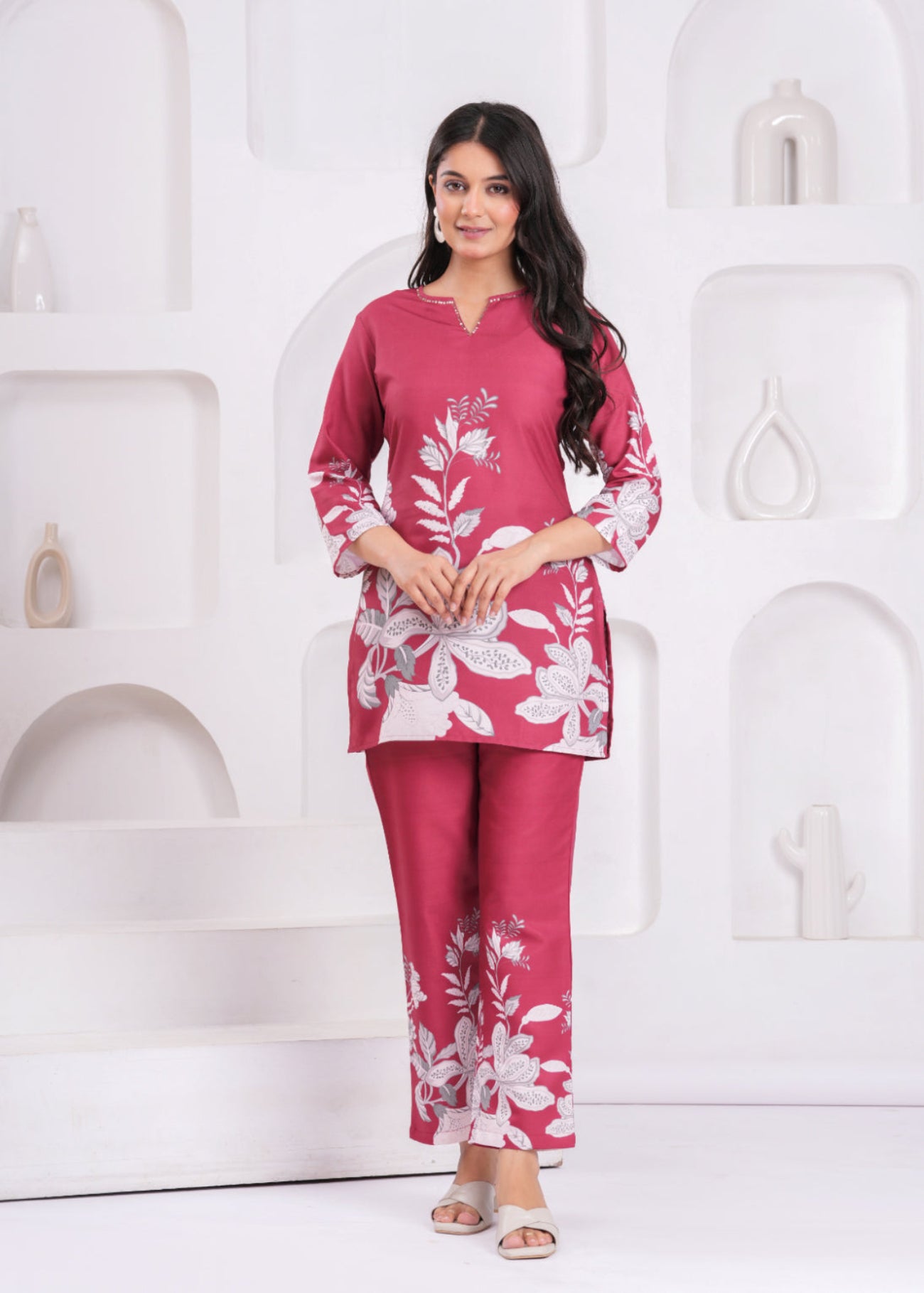 Stay stylish and comfortable with this cotton printed top-pant co-ord set from Maluka Women. The top features a graceful round neckline, beautiful hand work, and elegant 3/4 sleeves, creating a perfect blend of simplicity and charm. Paired with matching pants, this co-ord set is ideal for casual outings, travel, or everyday wear.